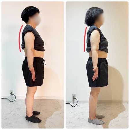 上図(左)は、真っ直ぐに立っているようには見えますが、お腹の力が抜けていて腰が反ったような姿勢になっており、その代償として背中(胸椎)が丸くなっています。それに対して上図(右)は腰の反り、背中(胸椎)の丸みのどちらも軽減しており、お腹にも適度な力が入っています。